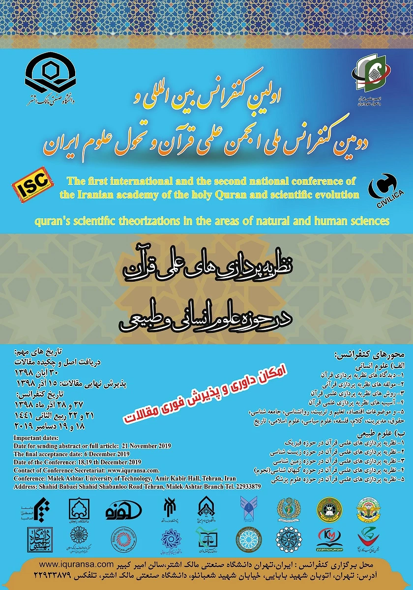 اولین "کنفرانس بین المللی نظریه پردازی های علمی قران در حوزه علوم انسانی و طبیعی" در روز های27 و 28 آذر ماه 1398 در تهران، دانشگاه صنعتی مالک اشتر برگزار می گردد. جهت آگاهی از محورهای کنفرانس و تاریخ های مهم به پیوست ها مراجعه نمایید.