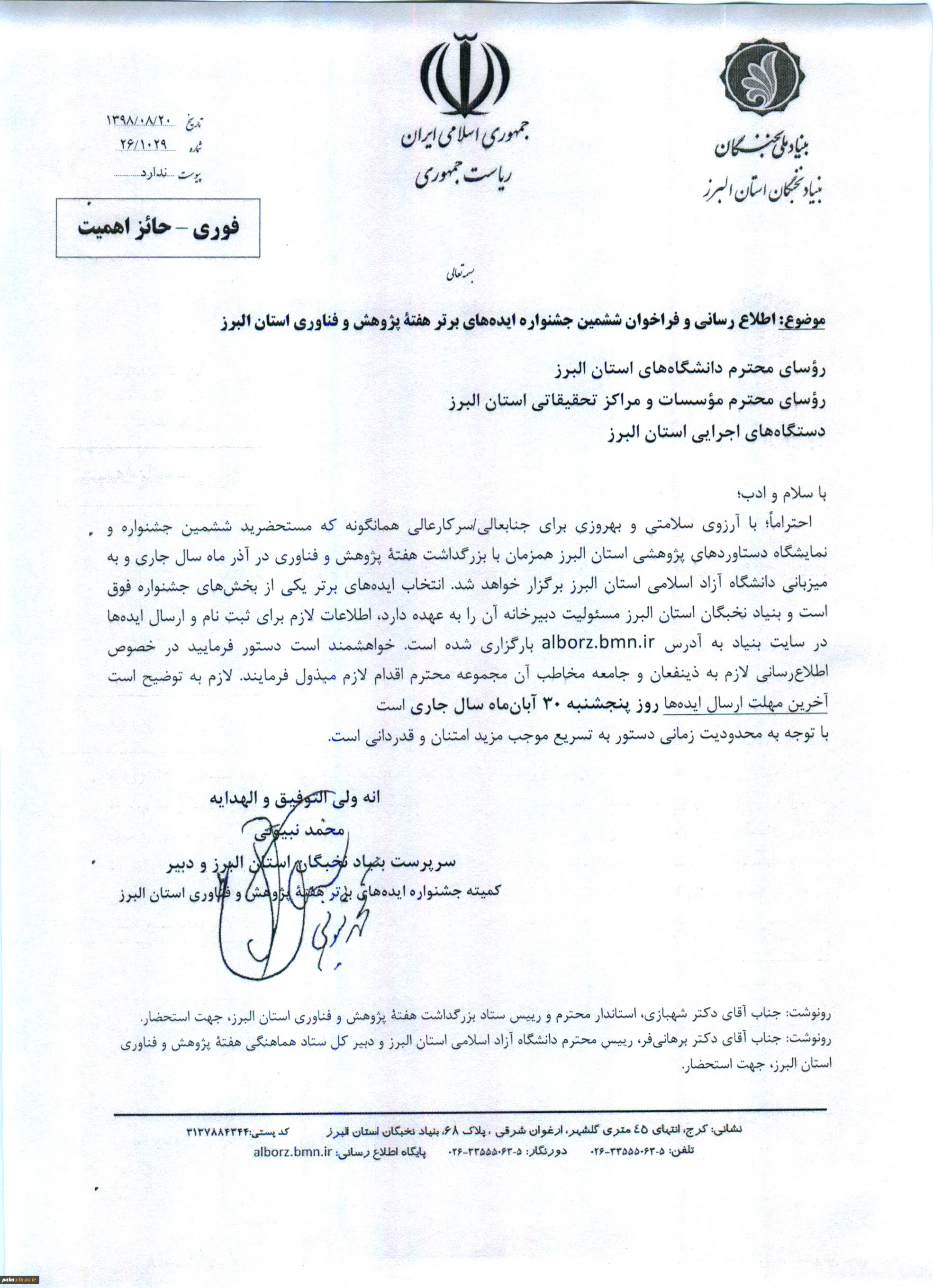 "برگزاری ششمین جشنواره و نمایشگاه دستاوردهای پژوهشی استان البرز به مناسبت هفته پژوهش به میزبانی دانشگاه آزاد اسلامی استان البرز"