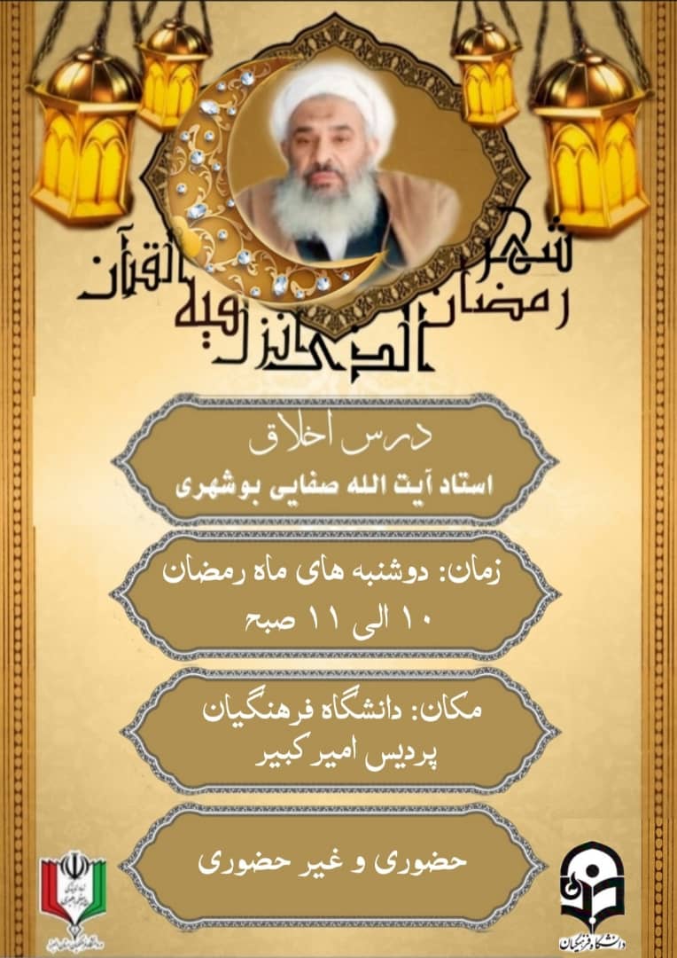 درس اخلاق استاد آیت الله صفایی بوشهری روزهای دوشنبه ماه مبارک رمضان از ساعت 10الی 11 در دانشگاه فرهنگیان پردیس امیرکبیر برگزار خواهد شد ؛ جهت شرکت در جلسات به صورت مجازی بر لینک زیر کلیک کنید