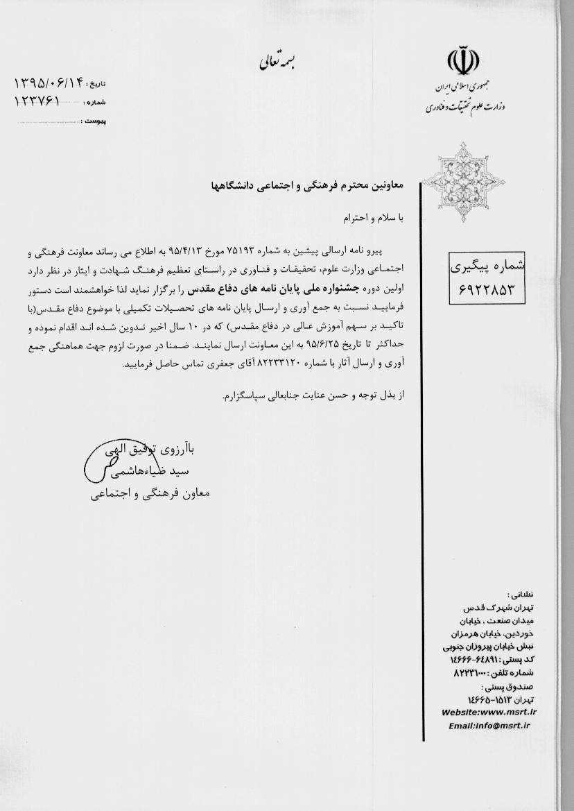 استادان و کارکنان محترم، جهت شرکت در اولین دوره جشنواره ملی پایان نامه های دفاع مقدس که از سوی معاون محترم فرهنگی و اجتماعی وزارت علوم ، تحقیقات و فناوری برگزار می گردد، خواهشمند است پایان نامه های تحصیلات تکمیلی خود با موضوعیت دفاع مقدس در 10 سال اخیر را حدکثر تا تاریخ 1395/06/25 به صورت مستقیم به معاونت مزبور ارسال نمایید.