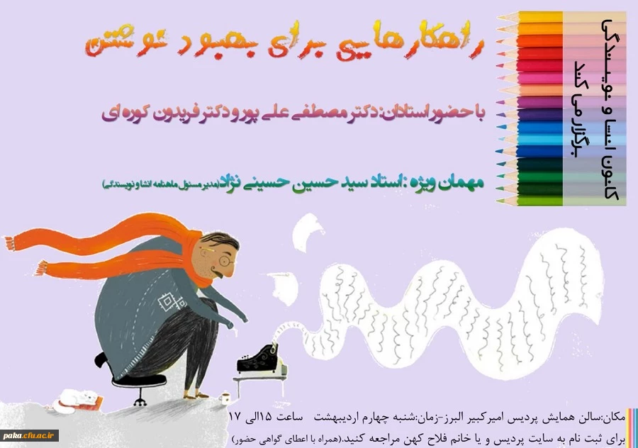 امتیاز دهید : کانون انشا و نویسندگی برگزار می کند: راهکارهایی برای بهبود نوشتن 2 دوشنبه 30 فروردین 1395 ساعت 11:29