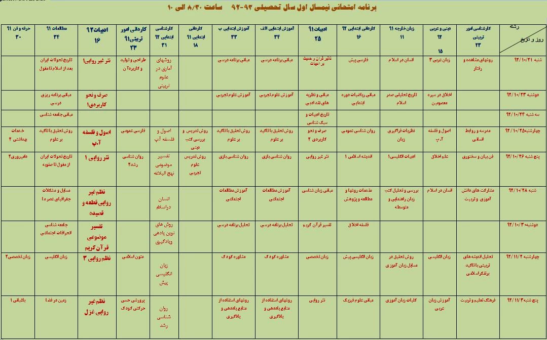امتیاز دهید : برنامه امتحانی نیمسال اول 93-92 کارشناسی ناپیوسته ساعت اول دوشنبه 18 آذر 1392 ساعت 9:44