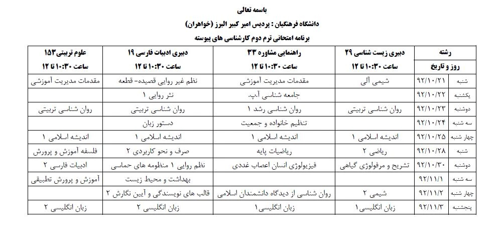 برنامه امتحانی نیمسال اول 92 ورودی 91 پیوسته
