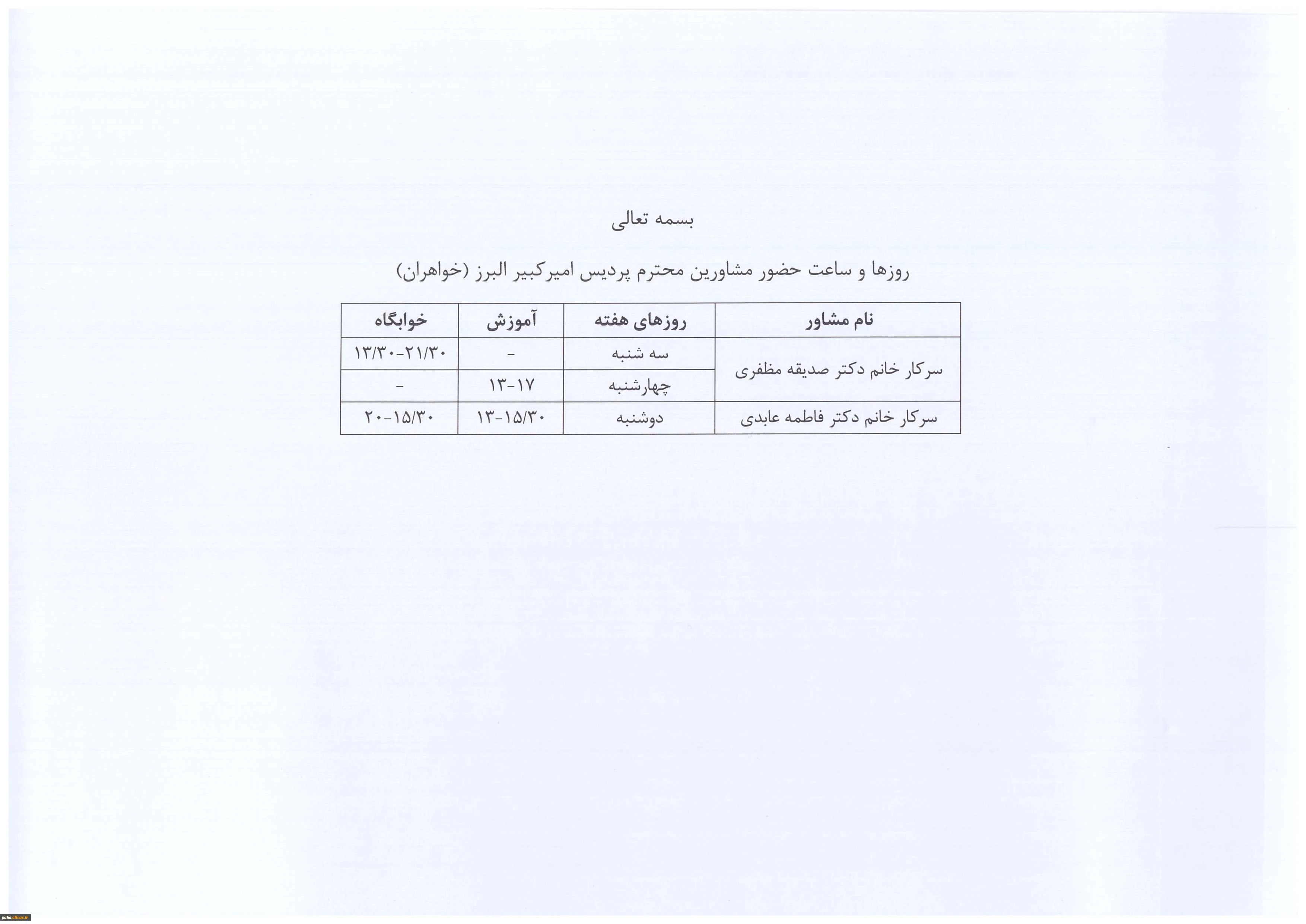 روز و ساعت حضور مشاوران پردیس امیرکبیر 2