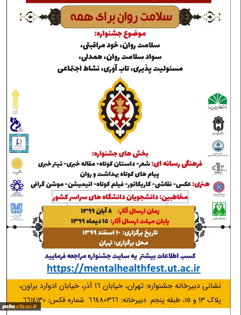 امتیاز دهید : اولین جشنواره ملی فرهنگی، هنری و بهداشت روانی با شعار "سلامت روان برای همه " 2 سهشنبه 20 آبان 1399 ساعت 10:55