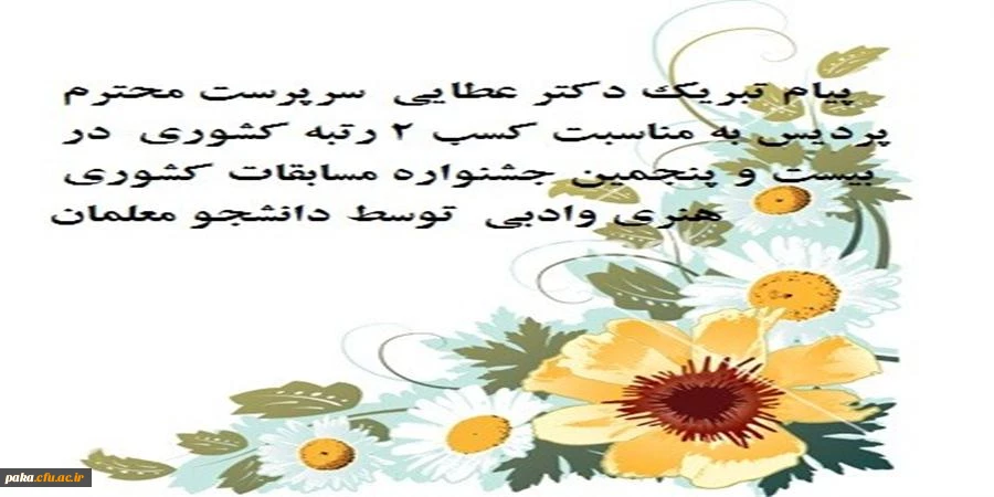 پیام تبریک سرپرست محترم پردیس به مناسبت کسب ٢ رتبه کشوری در بیست و پنجمین جشنواره مسابقات کشوری هنری وادبی توسط دانشجو معلمان پردیس امیر کبیرالبرز 2